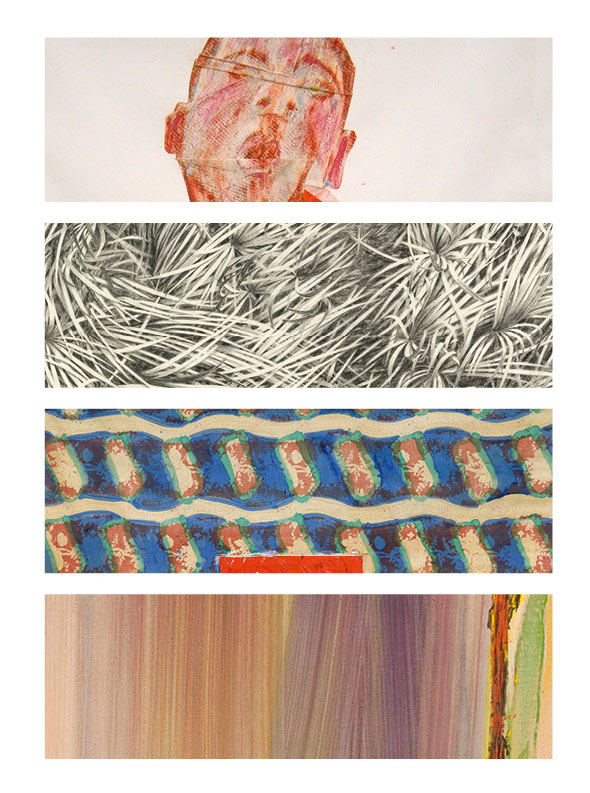 (PATRICK CHAMBON Drapé 2017, PHILIPPE COMAR La mesure de l’herbe 1991, CLAUDE VIALLAT Sans titre 2015 (052), OLIVIER DEBRÉ Rayée foncée d’Automne circa 1990.)